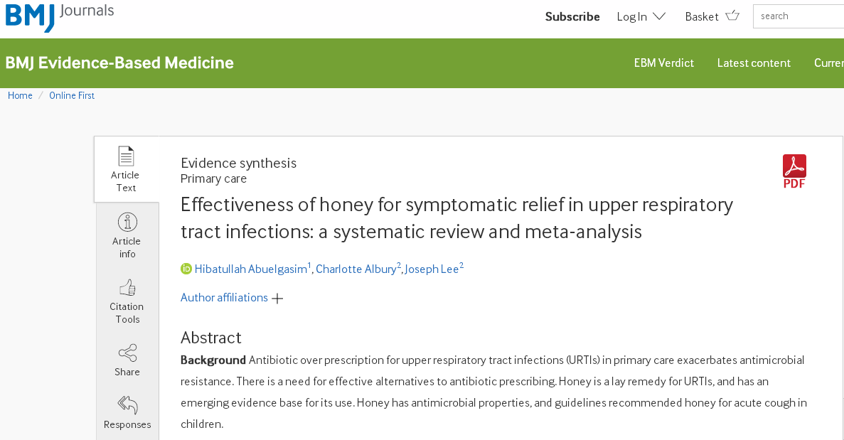 最近,來自牛津大學(xué)的三名科學(xué)家在《BMJ Evidence-based Medicine》(英國循證醫(yī)學(xué))上發(fā)表的一項研究稱,對于咳嗽、感冒、喉嚨痛等上呼吸道感染癥狀,與其用抗生素,還不如吃蜂蜜!
